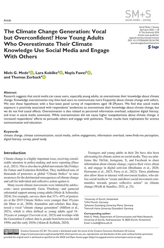 Based on a four-wave panel survey in Germany (n = 1,309), we find that young adults are more likely to overestimate their knowledge about climate change if they use social media often – but there was no causal relationship. Overconfident respondents were then more likely to engage with politicians and persuade others about their views. See the full paper in Social Media + Society for more details.Â